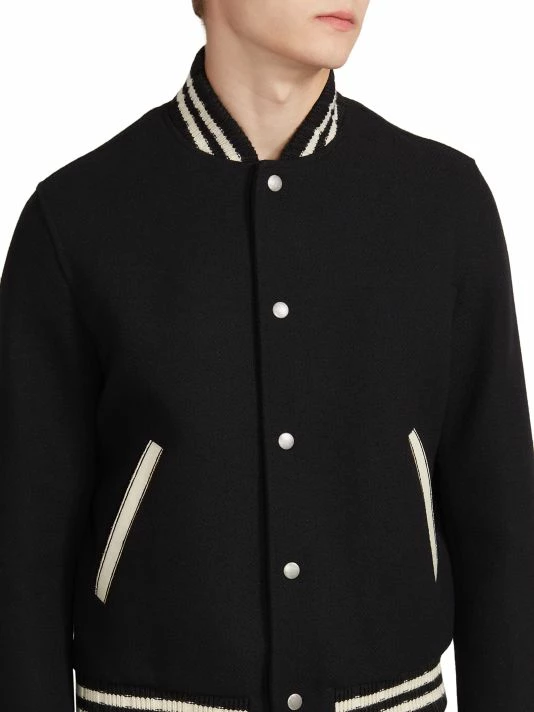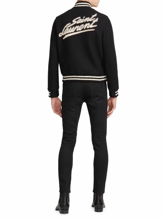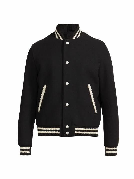 Classic varsity-style jacket designed with contrast stripe trim in a rich wool-blend finish.