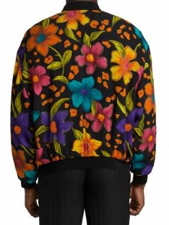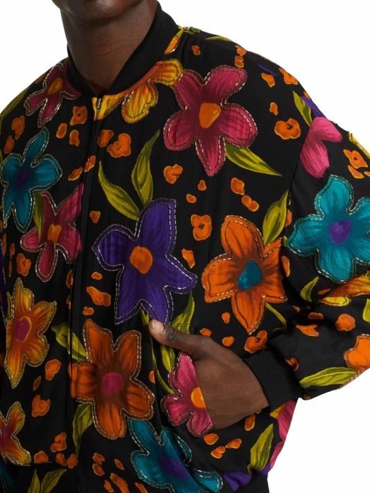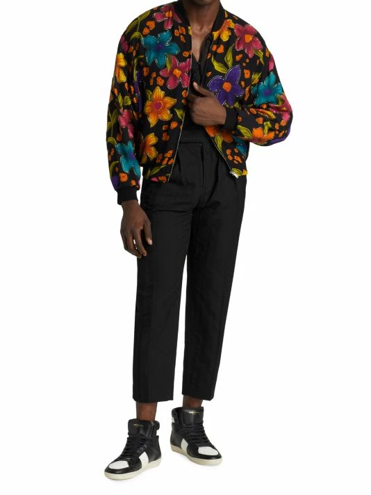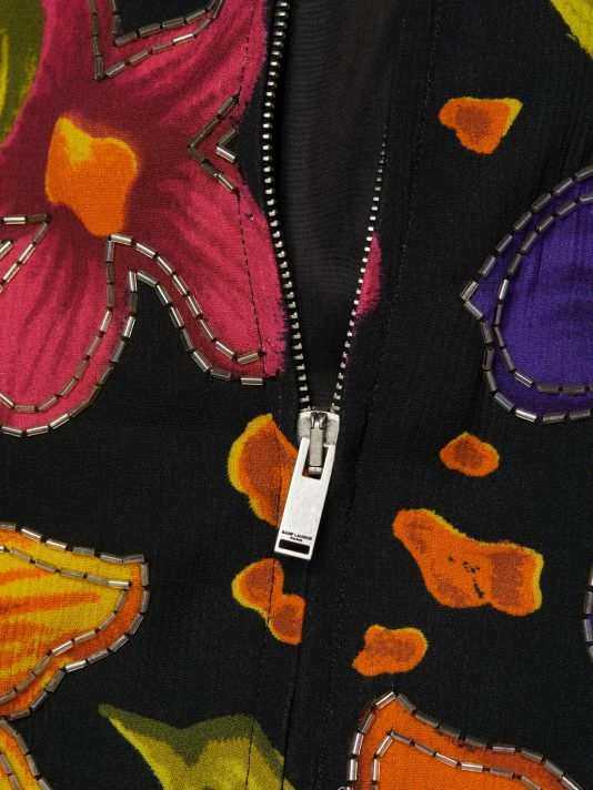 Made in Italy by Saint Laurent, this crépon bomber jacket is styled with a floral motif and beaded trim.