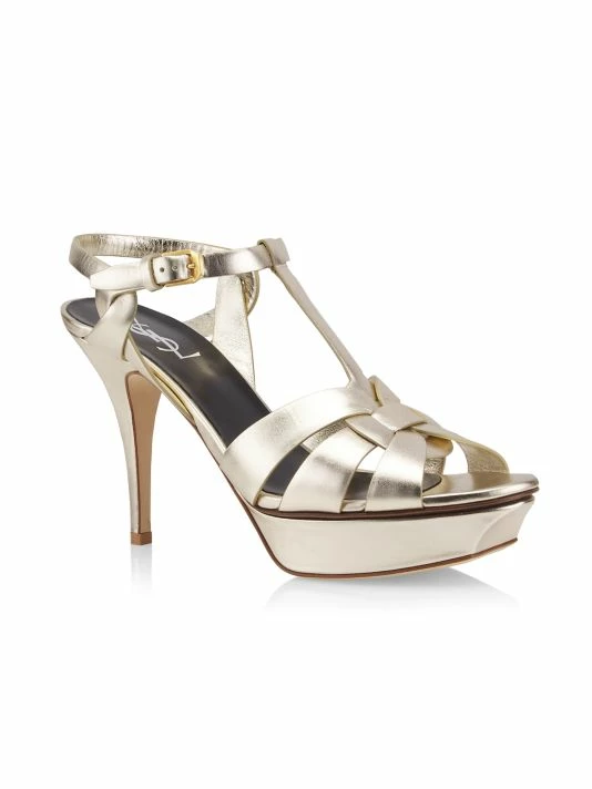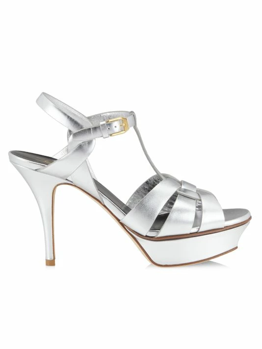 Styled in a strappy silhouette, Saint Laurent’s Tribute sandals are crafted of metallic leather.