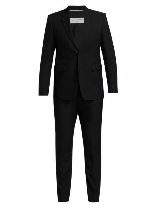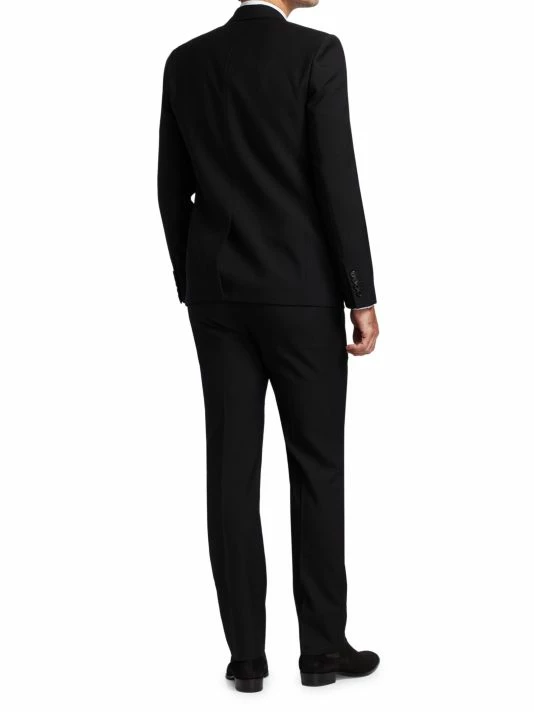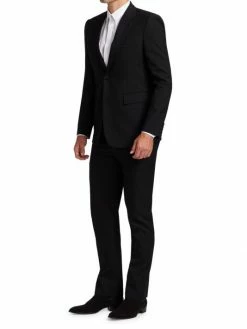 Classic two-button suit with notched lapel and flap pockets made from luxe virgin wool. Lined. Virgin wool/silk. Dry clean. Made in Italy.