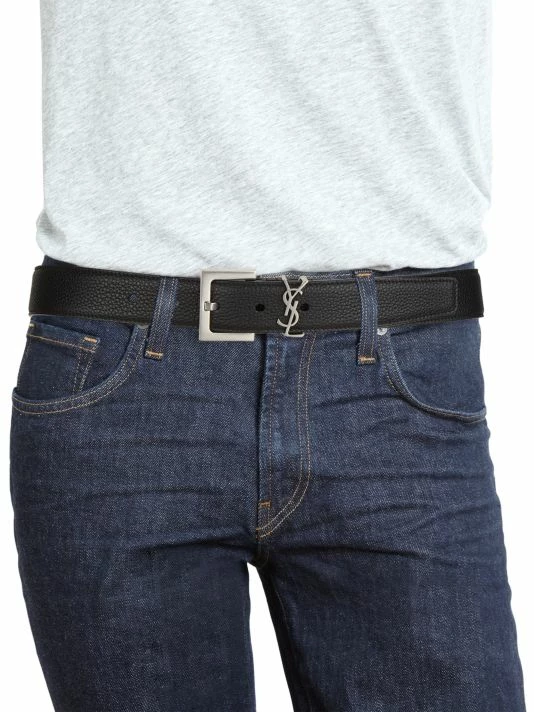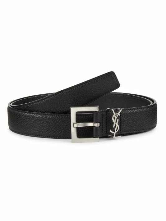 Bold silvertone logo elevates fashionable belt in pebbled leather finish.