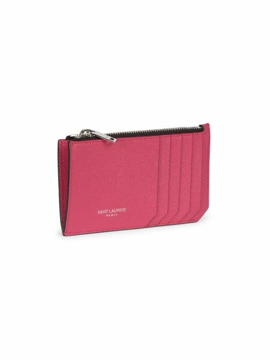 Saint Laurent introduced its famous Le Smoking tuxedo in 1966, a rendition of the classic men’s smoking suit made for women. Inspired by the iconic silhouette and 1970s women’s archival pieces, Creative Director Anthony Vaccarello reinterprets these styles for menswear with slinky, billowing shapes, delicate textures, and intricate patterns. The result is a unique, androgynous look that celebrates fluidity as a cornerstone of contemporary fashion. A stylish yet functional design, this vibrant leather cardholder flaunts a metallic foil logo, five card slots, and a zippered compartment.